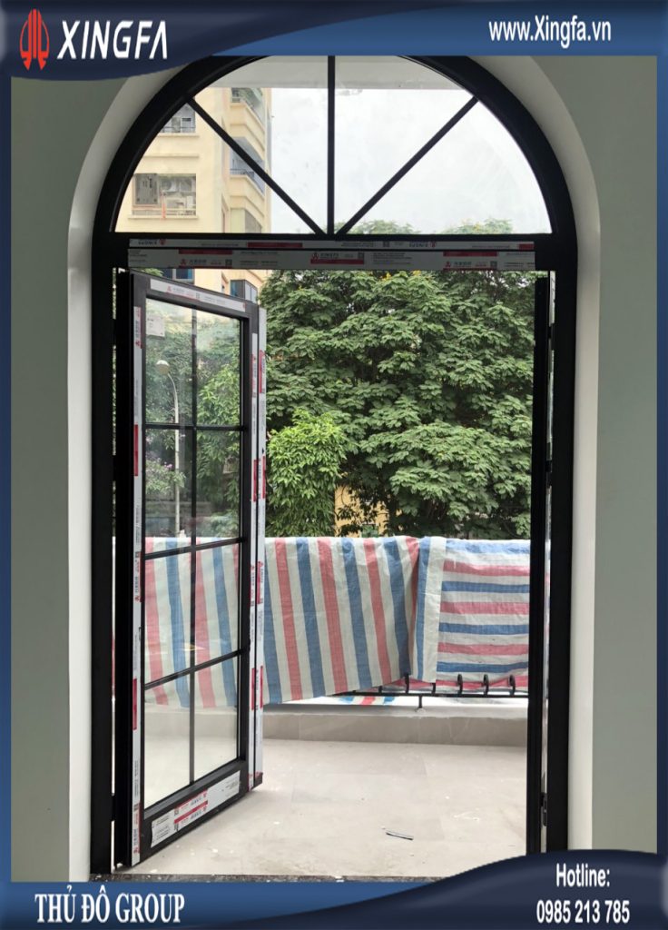 Hình ảnh mẫu cửa đi mở quay 2 cánh uốn vòm nhôm Xingfa nhập khẩu chính hãng