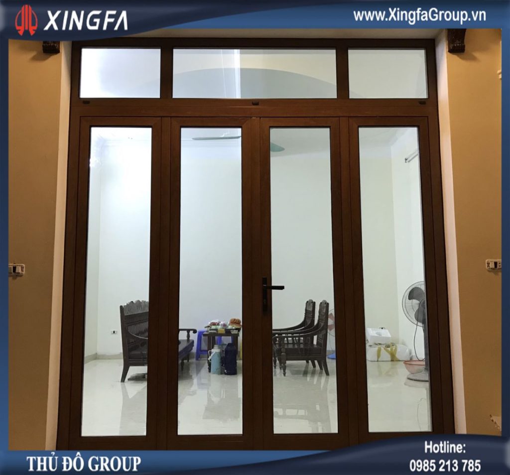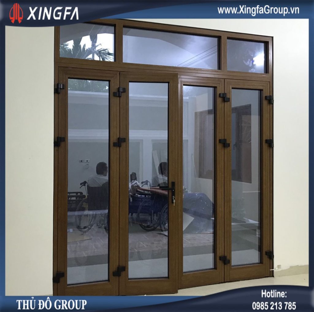 Hình ảnh cửa đi mở quay 4 cánh nhôm Xingfa màu vân gỗ chính hãng