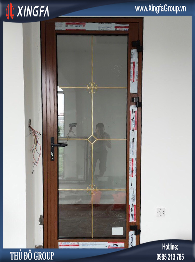 Ở một vị trí khác, Thủ Đô Group lắp đặt sản phẩm cửa đi mở quay 1 cánh nhôm Xingfa cùng với các tấm vách kính cố định. Có một điều đặt biệt ở đây đó là bộ cửa này sử dụng kính hộp 2 lớp có nan đồng trang trí. Việc sử dụng kính hộp có nan trang trí không chỉ làm tăng nét thẩm mỹ mà thực tế 2 lớp kính ở giữa hút chân không giúp cho việc cách âm cách nhiệt tăng đáng kể. Chính vì vậy mà mặc dù có giá thành cao nhưng sản phẩm lại đang ngày càng trở nên phổ biến.