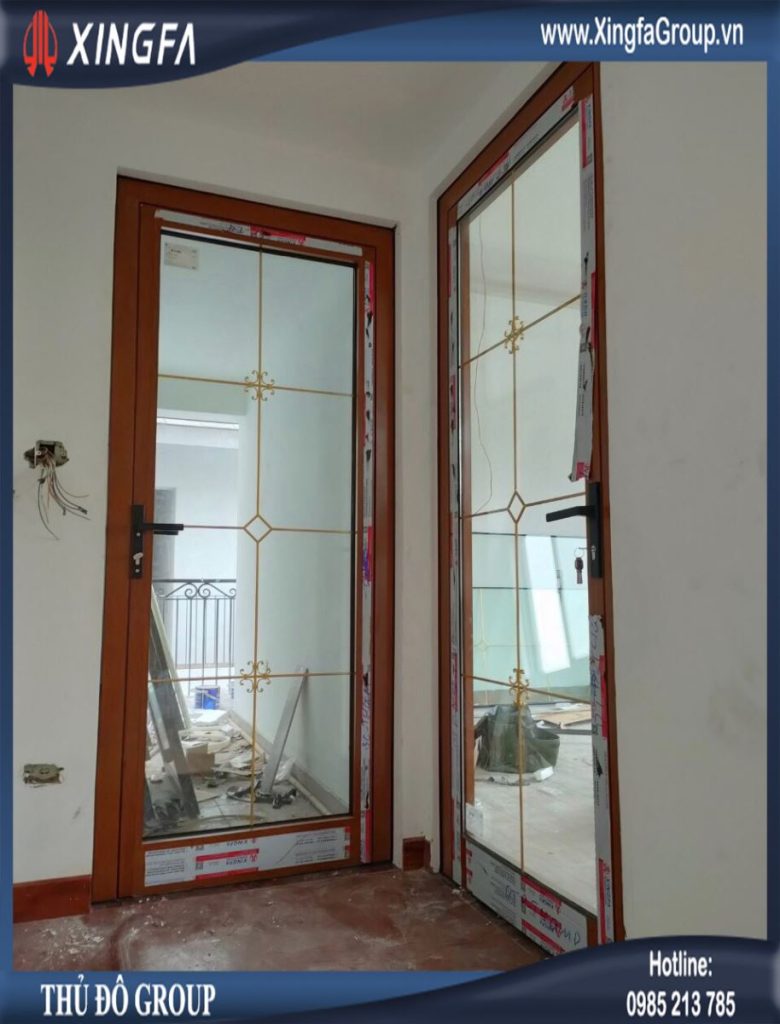 Hình ảnh cửa đi mở quay nhôm Xingfa vân gỗ, kính hộp có nan trang trí