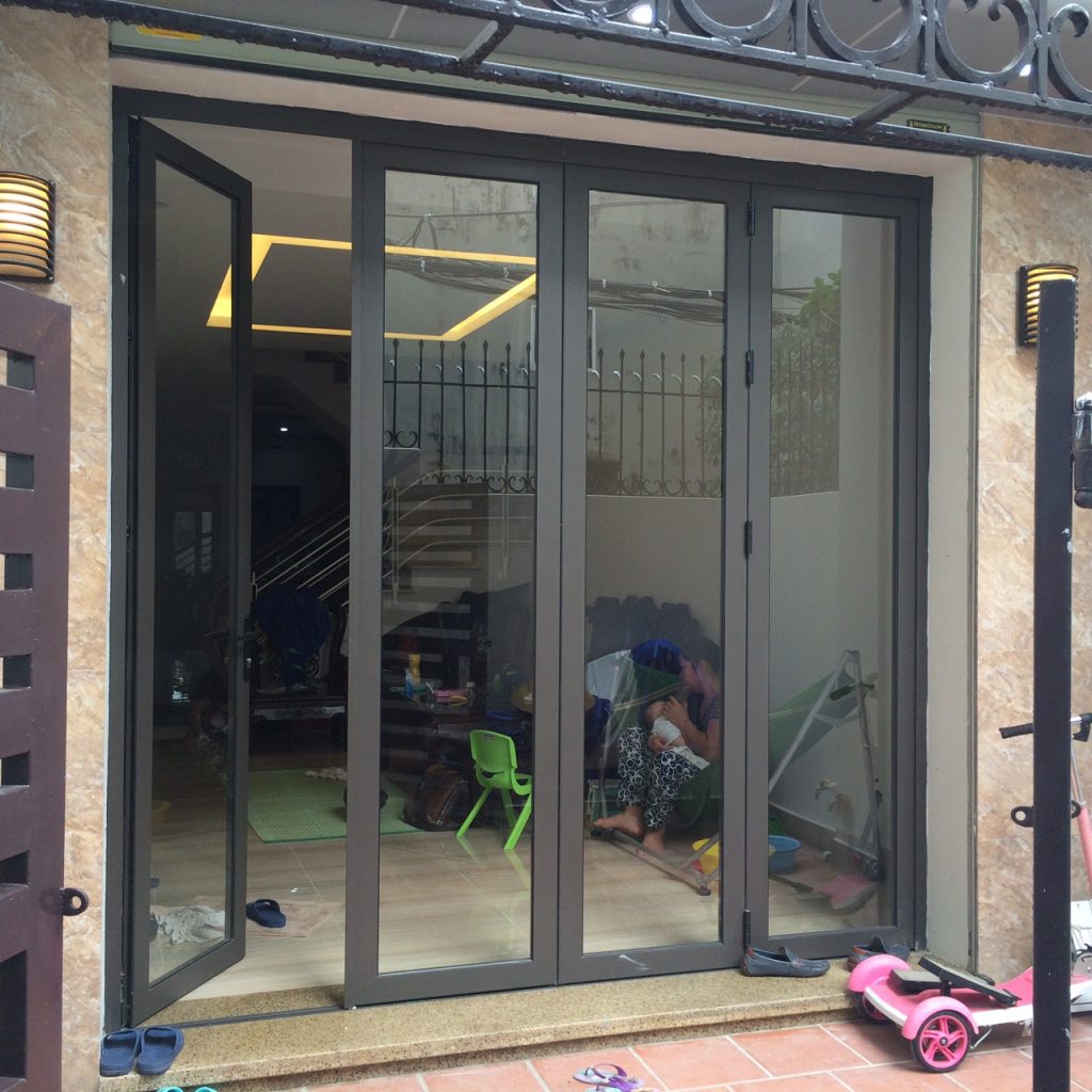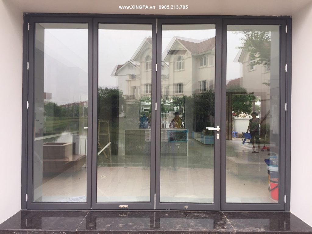 Hình ảnh mẫu cửa nhôm Xingfa 4 cánh mở xếp trượt gấp dùng cho hệ cửa đi chính của nhà mặt tiền phố hiện nay (sử dụng thanh nhôm Xingfa hệ 63 dày 1.8-3.5 mm để làm cửa)