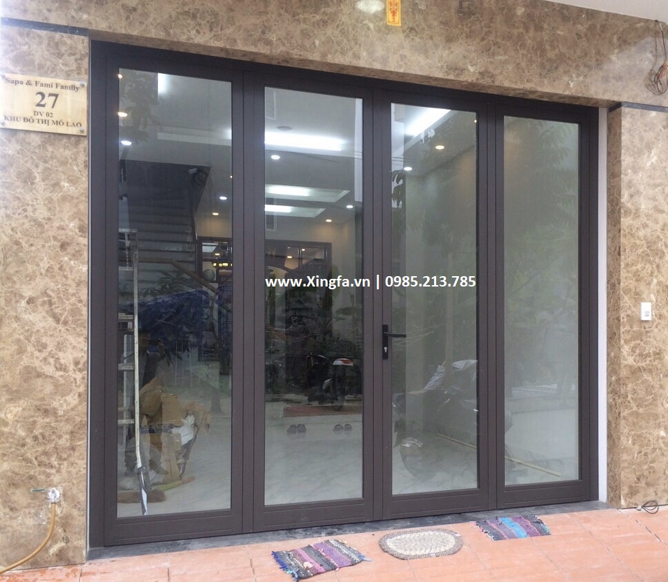 Hình ảnh mẫu cửa nhôm Xingfa 4 cánh sử dụng cho hệ thống cửa đi chính của nhà mặt tiền phố (sử dụng thanh nhôm Xingfa hệ 55 dày 2.0mm để làm cửa)
